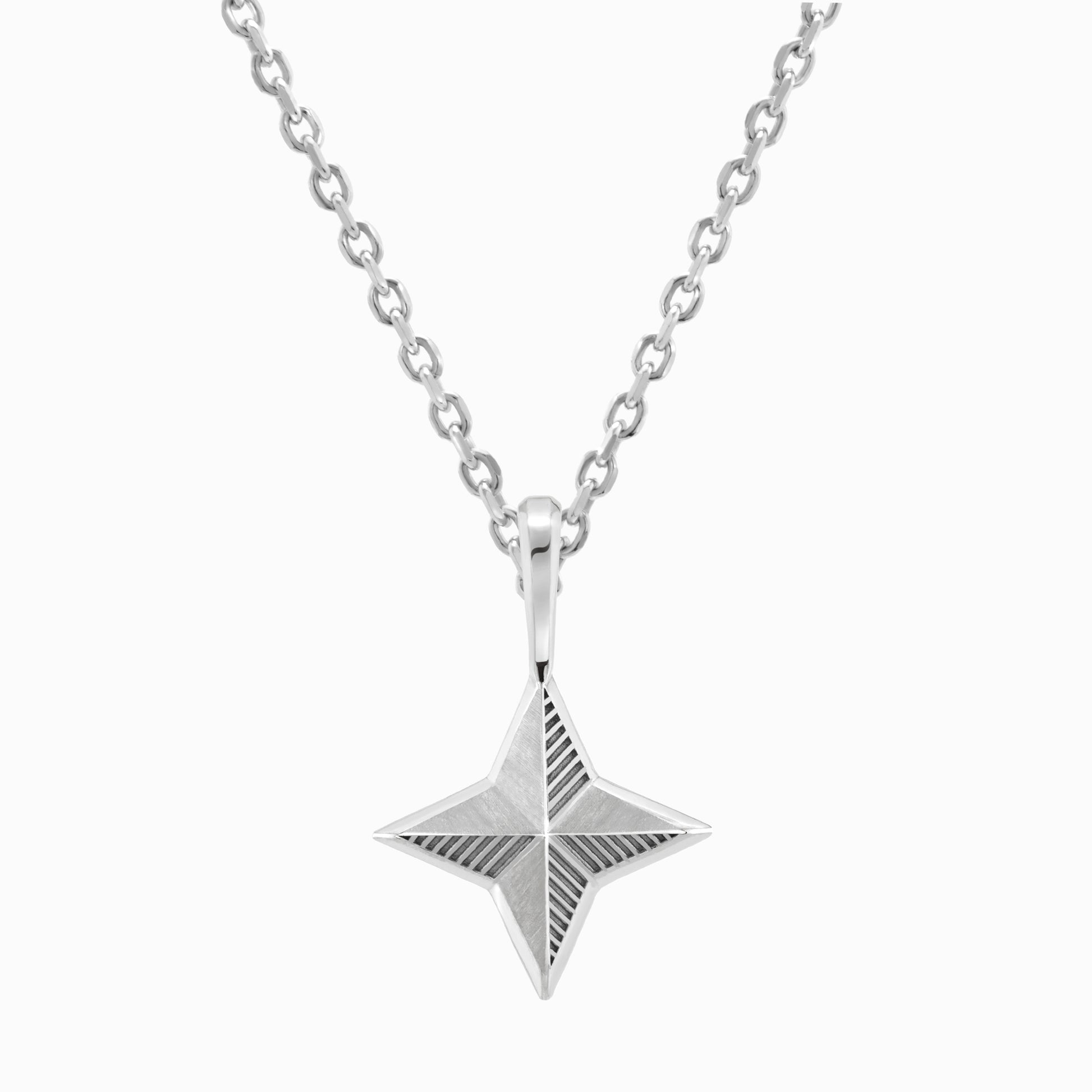 The FIERCE Cheeky Grill necklace features a four-pronged 3-dimensional pendant with a combination of graphic lines, satin finish and high-polished beveled edges. Powerful and intense, it wears well on our sterling silver diamond cut cable chain in your choice of length. Each pendant is handcrafted with hand-applied satin finish and black rhodium in recessed areas, and may vary slightly from piece to piece.