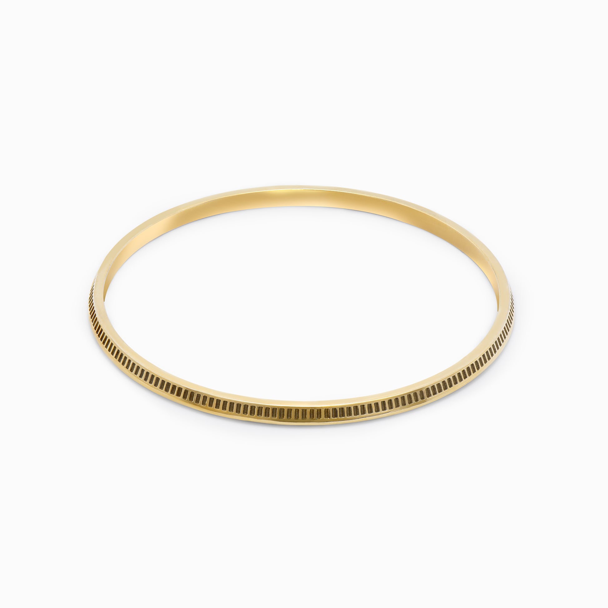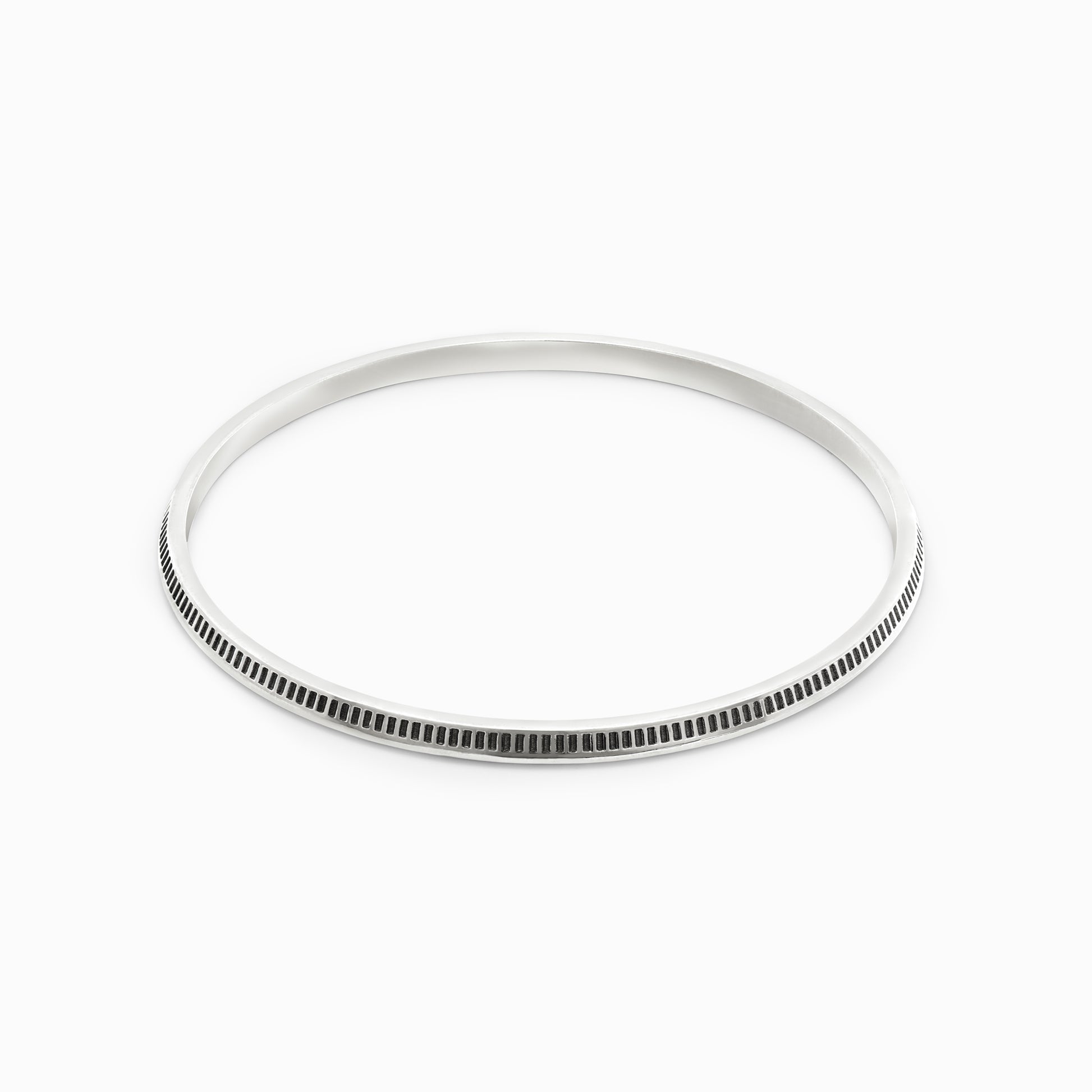 The OFF-KILTER Audacious Turbine Bangle features a high polished finish with darkened grooves for a more graphic element. The asymmetrical design with angled silhouette contrasts the crisp polished top edge that adds a flash of shine. Striking on its own, it pairs well with other bangles in the collection or stacked with another bracelet or watch. Each bangle is handcrafted and may vary slightly from piece to piece.