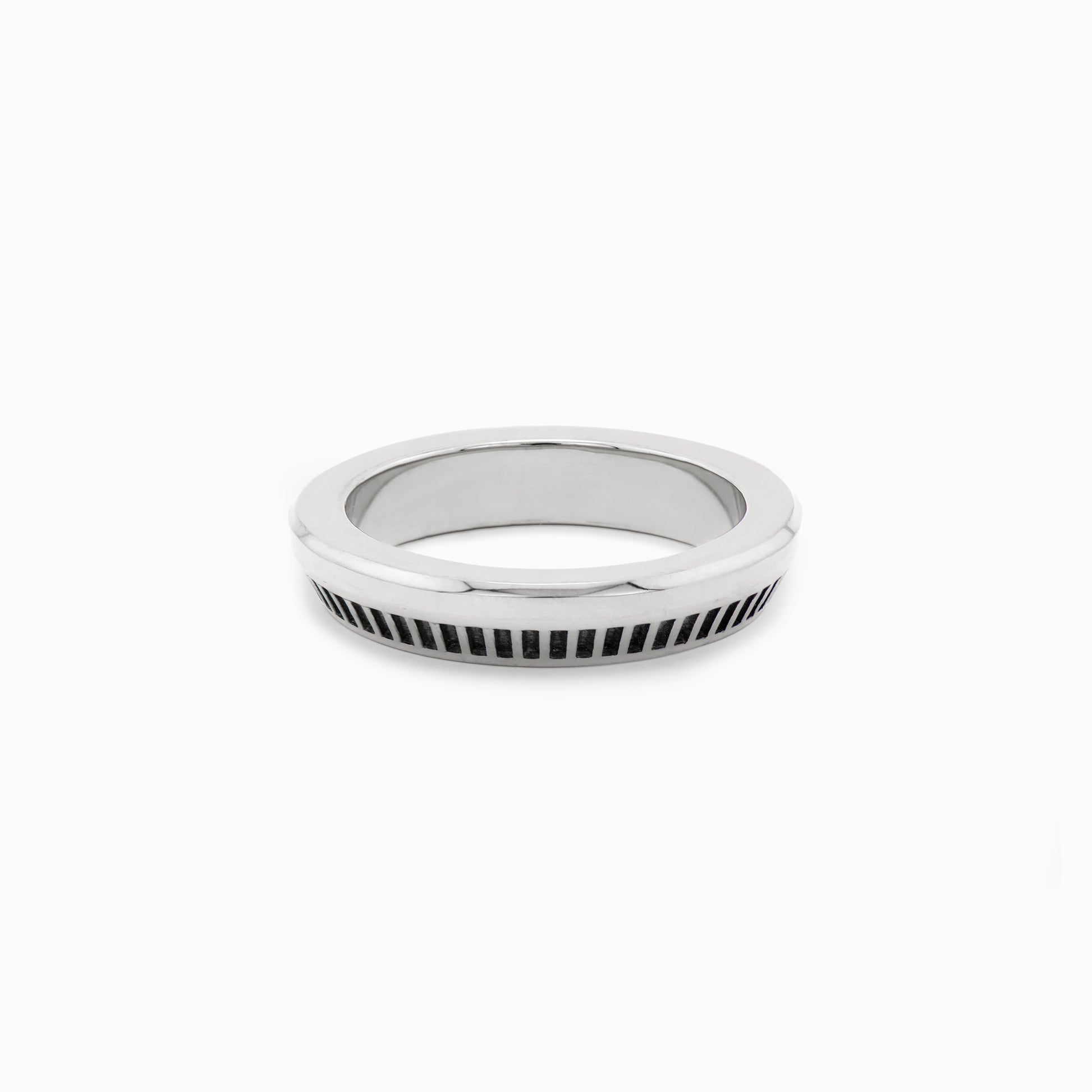 The OFF-KILTER Outrageous Turbine Stacking Ring features a high polished finish with darkened grooves for a more graphic element. Representing a disruptor, the asymmetrical design with angled silhouette contrasts the crisp polished top edge that adds a flash of shine. Striking on its own, stacking them together is where the magic happens. Mix, match and stack with other rings in the collection to create a dynamic look. Each ring is handcrafted in sterling silver and may vary slightly from piece to piece.