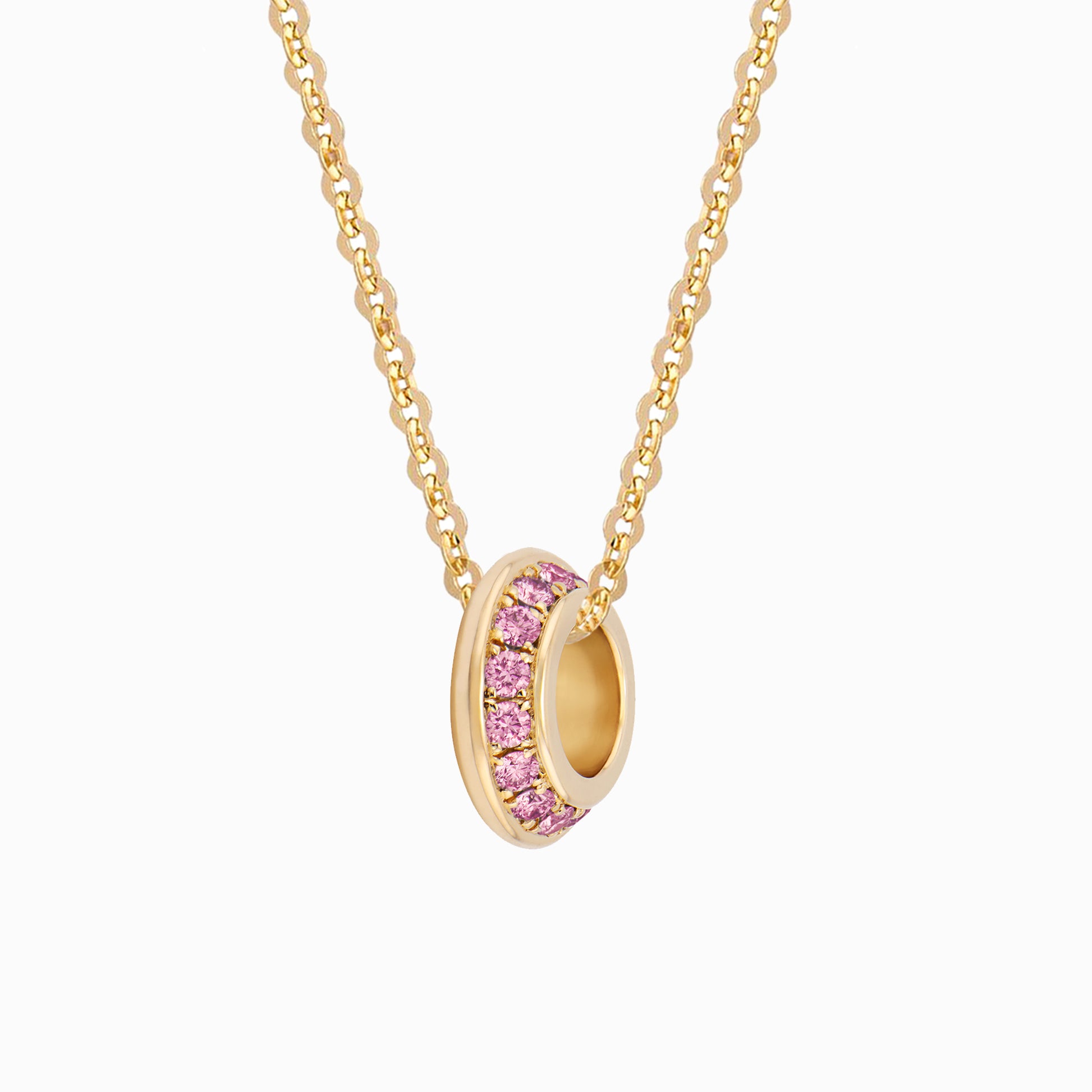 The OFF-KILTER Pink Tourmaline Rondelle Fine Necklace features a full circle of pink tourmalines – October's birthstone. Representing a disruptor, the asymmetrical design with angled silhouette contrasts the crisp polished top edge that adds a flash of shine. Striking on its own, it wears well on our solid gold flat cable chain in your choice of length. Each rondelle is handcrafted with pavé-set genuine pink tourmalines and may vary slightly from piece to piece.