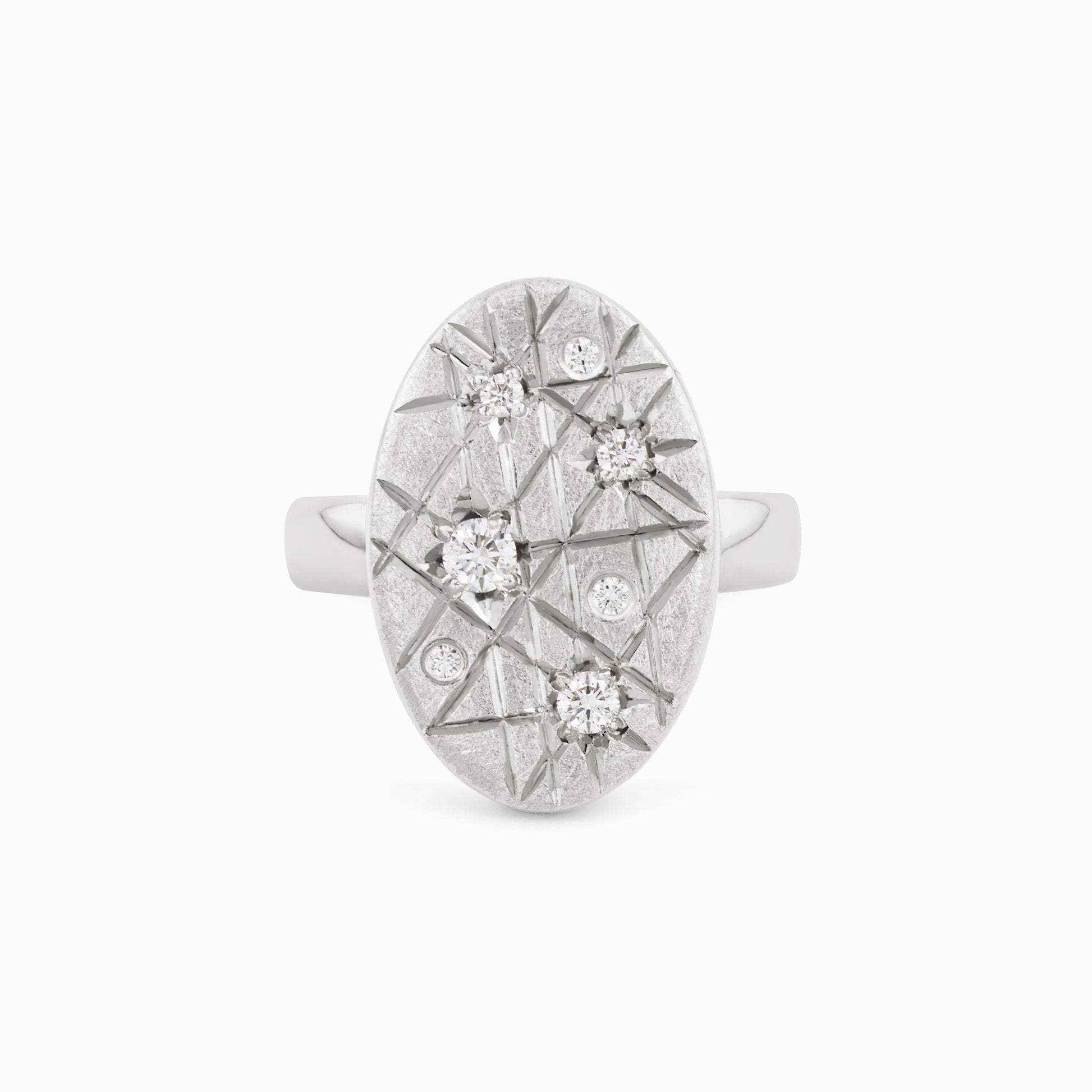 The TRIUMPHANT Outrageous Diamond Ellipse silver ring features a distressed engraved top finish with polished edges and 7 diamond highlights, exuding a rugged elegance. Each ring is handcrafted in sterling silver with hand-set natural diamonds and hand-applied battle scars, and may vary slightly from piece to piece.